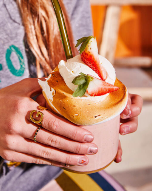 For the marshmallow fluff, place the egg white and fine sugar in a food processor. Mix briefly first and then whip on high speed for about 5-8 minutes until a firm mass forms. Pipe a thick rim of marshmallow fluff on the edge of your cups and lightly caramelize with a blowtorch.
