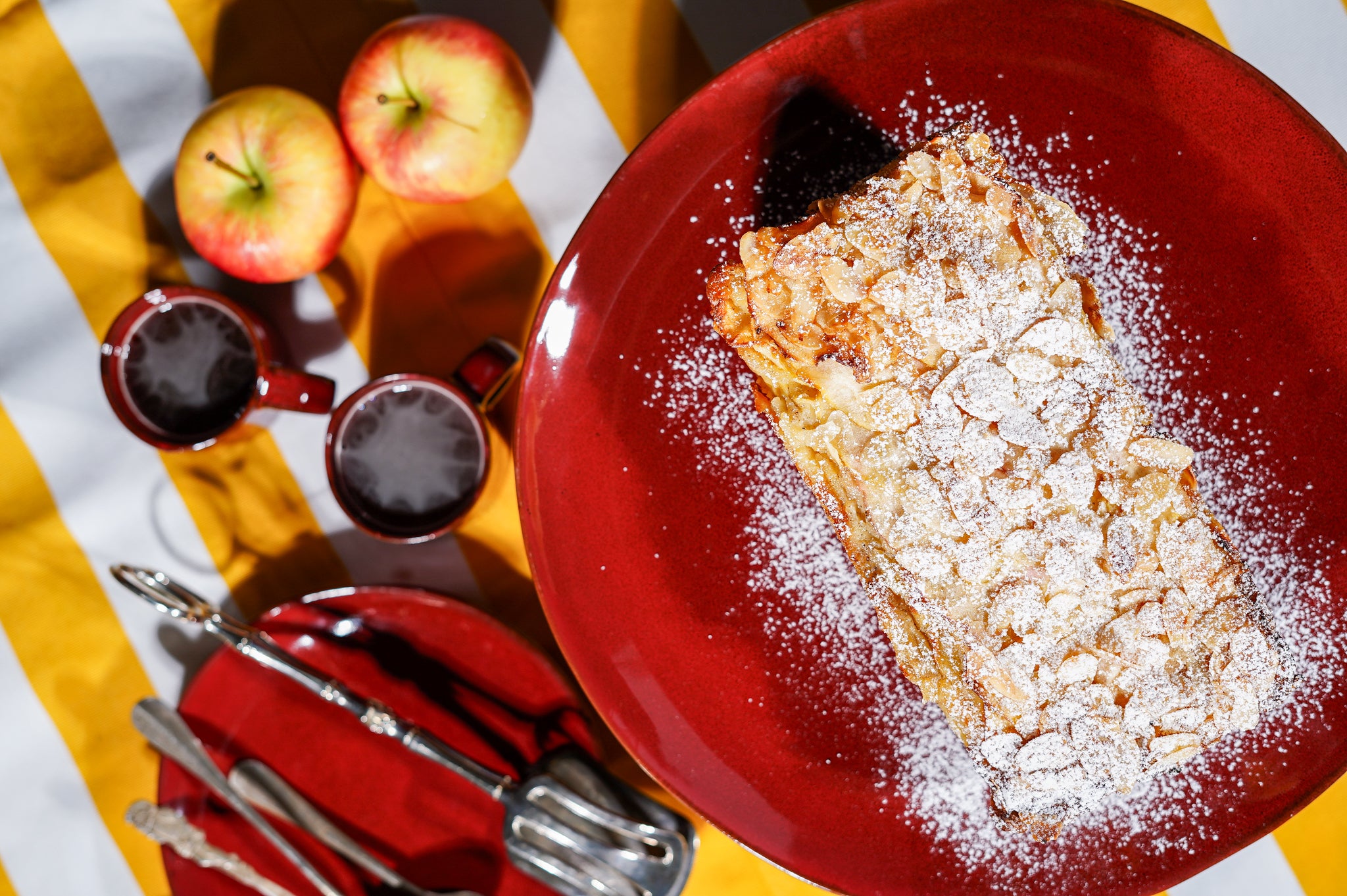 Spoon the mixture into the cake tin and press lightly. Top with the remaining apple slices, arranged in a stepped pattern, and sprinkle with flaked almonds.