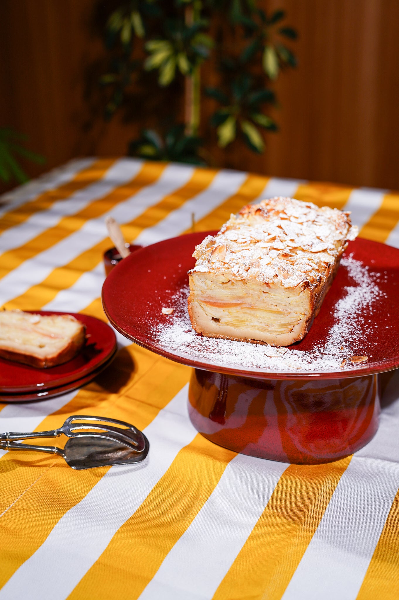 Core the apples with an apple corer and slice them very thinly with a mandolin or a sharp knife. Reserve about a dozen slices for the top of the cake.