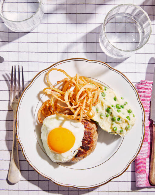 Serving: Serve the puree with the cheeseburger, topped with the fried egg and onion rings. Enjoy!