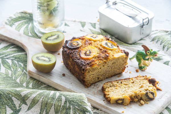Place baking paper in your cake tin and pour the mixture in, placing 6 slices of kiwi on top.