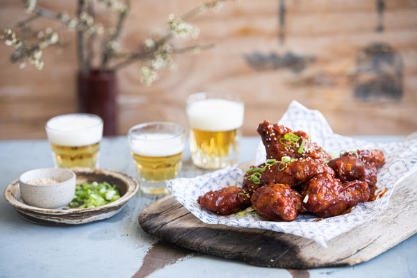 Heat your oil to 160°C. Place the pieces of chicken in one by one, making sure to separate them if they stick to the bottom of the pot, and turn them occasionally. After 8 minutes, remove the chicken from the fryer and place it on a plate with paper towels. Remove the crusts/residues from the frying oil. Then increase the fryer temperature to 170°C and fry the chicken for another 6 minutes.