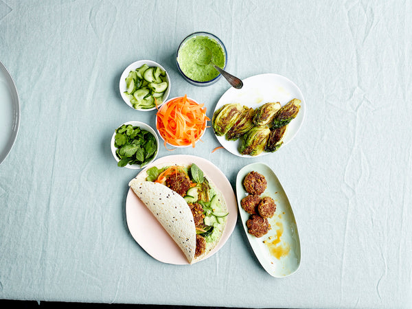 Warm the wraps according to the instructions on the package. Place the mini burgers, the raw vegetables, the lettuce hearts, and the hummus separately on the table, so everyone can fill their own wrap to their liking.