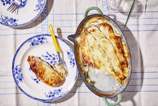 Lazy lasagna with zucchini, ham, and Provolone cheese