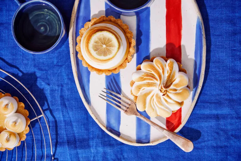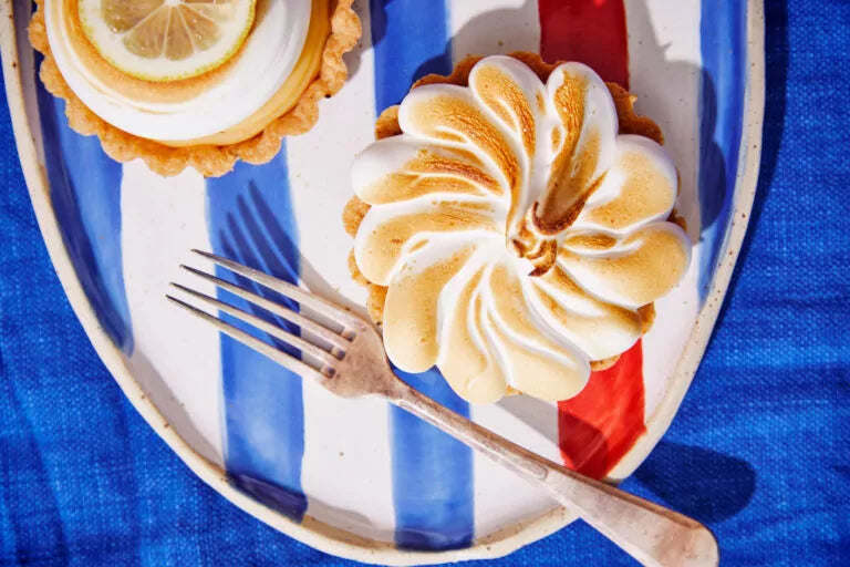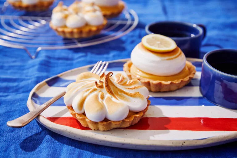 Place the meringue in a piping bag. Pipe dots onto the tartlets and torch with a Bunsen burner.