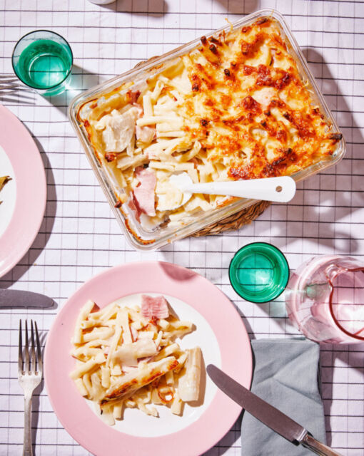 Cut the ham into strips and add it along with the pre-cooked macaroni to the sauce.