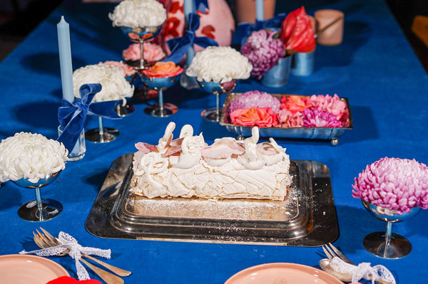 Meringue decoration: Whip 100 ml of egg whites with 100 g of fine sugar to stiff meringue, fold in 80 g of icing sugar. Fill a piping bag and pipe patterns on baking paper. Dry in the oven at 90°C for 1 hour.