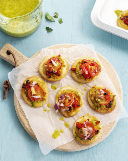 Continue with the pizzas: 1. Preheat the oven to 200ยฐC. 2. Heat a splash of oil blend for hot preparations in a pan and sautรฉ the finely chopped garlic together with 1 teaspoon of ras el hanout over low heat. 3. Cut the bell pepper into fine cubes and squeeze the lemon. Finely chop the mint. 4. Add the bell pepper cubes to the pan and let them cook for two minutes. Deglaze the ingredients with 4 tablespoons of lemon juice and add the finely chopped mint. Season with pepper and salt, then remove the pan from the heat. 5. Roll out the puff pastry. Use a cookie cutter or a glass to cut circles from the puff pastry. These will be the pizza bases. 6. Arrange the bases on a baking sheet lined with parchment paper and spread them with hummus. Leave 1 centimeter from the edge. 7. Distribute the bell pepper mixture over the pizza bases. 8. Place the mini pizzas in the preheated oven and bake for 15 to 20 minutes until they are nice and crispy.