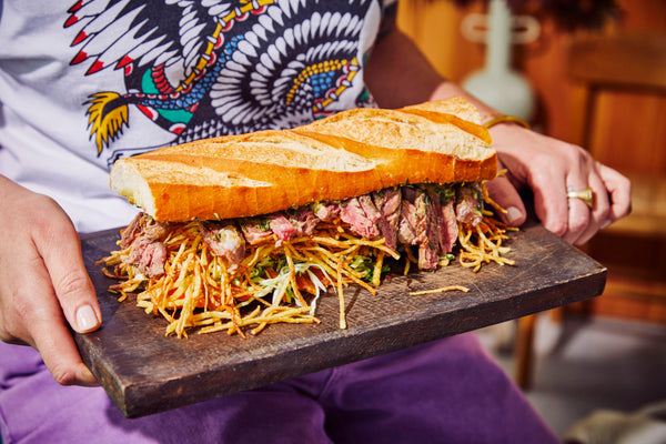 Take the meat out of the fridge at least 1 hour in advance, season with pepper and salt, and lightly rub with a bit of olive oil. Finely chop everything for the salad, season with pepper and salt, and mix in the lemon juice. Cut the baguette into 4 equal parts and slice them in half; spread some beurre café de Paris evenly on the top pieces and grill the 4 bottom pieces with cheese.