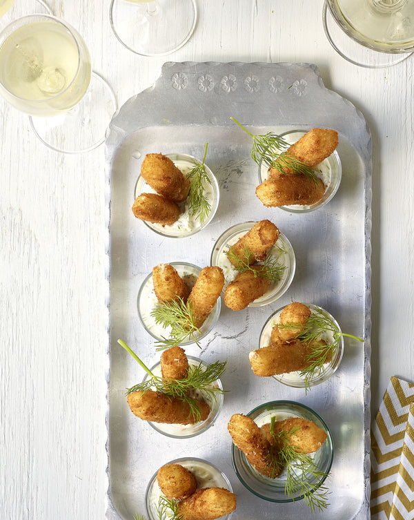 Divide the tzatziki among glasses, add the croquettes, garnish with dill, and serve.