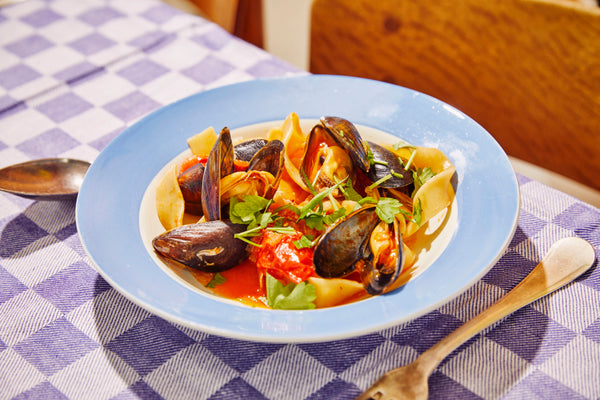 Meanwhile, rinse the mussels, remove any that are broken or remain open. Cook the pappardelle as indicated on the package. Remove the lid from the sauce, taste to see if you need to adjust the seasoning, and let it simmer further so that the sauce thickens nicely, as the mussels will also release a lot of delicious moisture while cooking. Once nicely thickened, add the mussels, stir well so they are nicely coated in the sauce, and cover, letting them cook for 3 to 4 minutes or until they open.