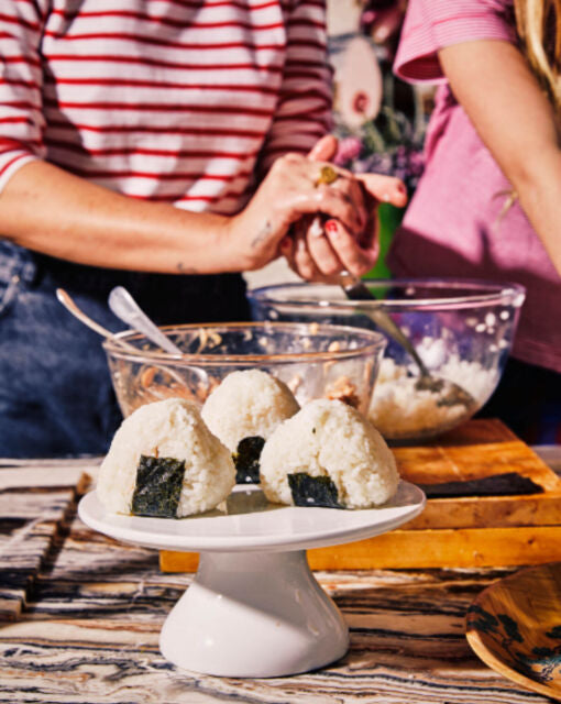 Wrap a nori sheet around the bottom of the rice and serve on a platter.