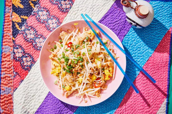 Add the soaked rice noodles to the pan. If they stick together, rinse them again with warm water. Deglaze with the classic Pad Thai sauce made from tamarind, fish sauce, water, cane sugar, and lime juice that you first mix together. Stir-fry for a few more minutes. Adjust the quantities to taste.