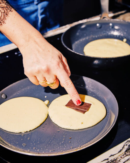 Heat a large frying pan and grease it with some butter. Place 3 tablespoons of batter a little apart in the warm pan, place a piece of chocolate on top, cover with a spoonful of batter, and let it cook for about 2 minutes over medium heat. Flip them over and let the other side cook for another minute. Cook the entire batter this way.