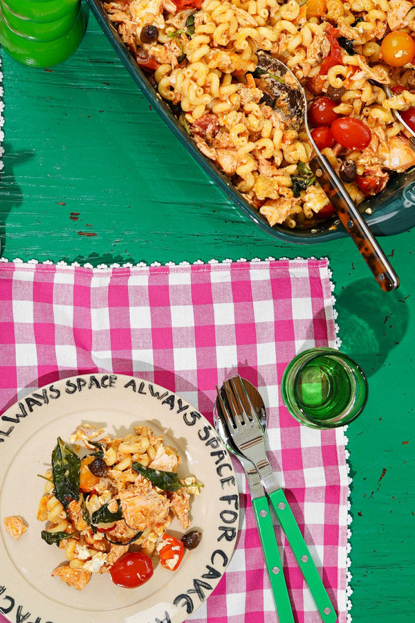Pasta with feta, salmon and harissa, confit cherry tomatoes and garlic from the oven