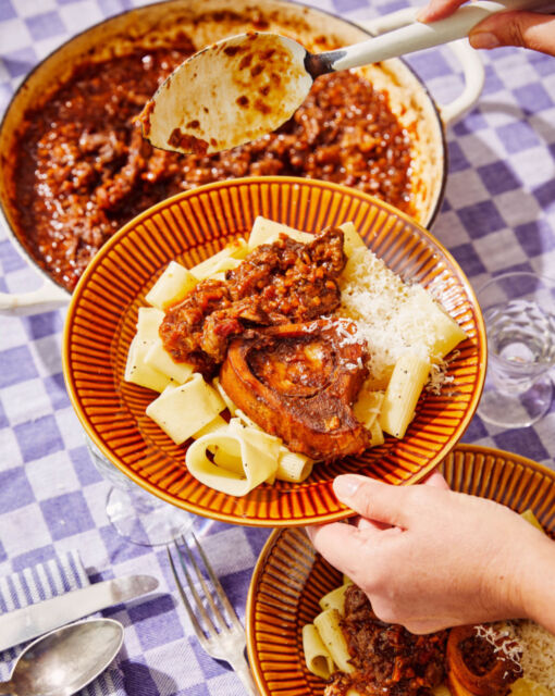 Serve the ossobuco on the pasta, finished with marrow, cheese, and parsley.