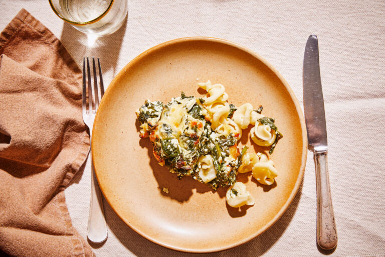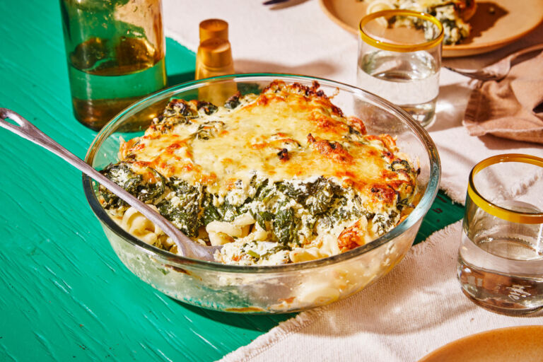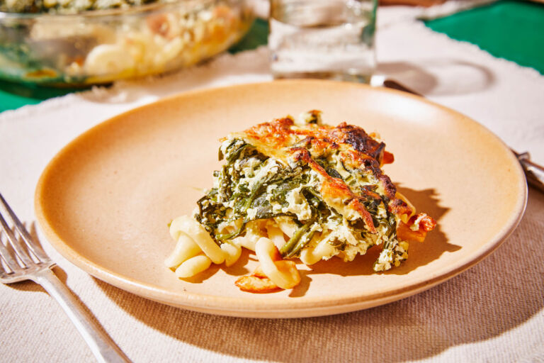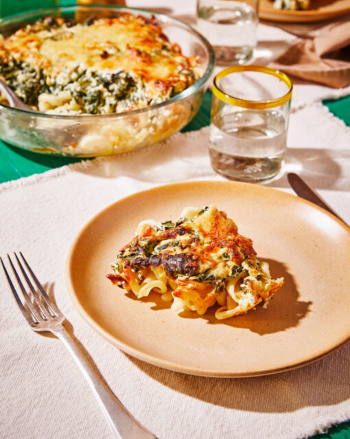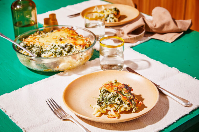 Discover a delicious vegetarian version of Greek pasticcio: a casserole with spinach, ricotta, and a rich layer of cheese.