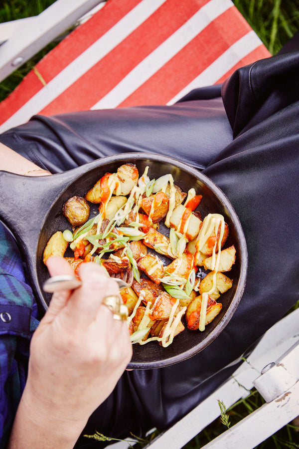Put the fresh mayonnaise in a piping bag and pipe it in lines over the potatoes.