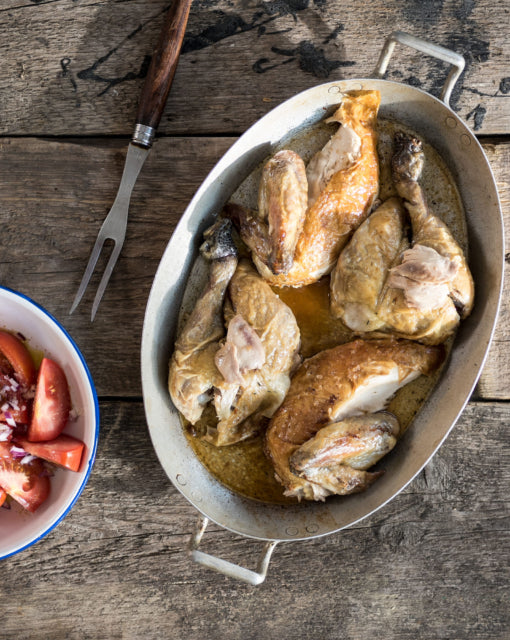 Place the chicken in a baking dish and rub it with butter. Sprinkle with salt and pepper. The chicken is now ready to go in the oven for 60 minutes at 185°C. Baste the chicken occasionally with the juices. To ensure the chicken is cooked, poke between the breast meat and thigh with a meat fork, lift and tilt; if the juices that run out are clear, then it is done.