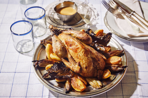 Remove your pheasant from the oven, cut off the string and keep the crispy leaves as a garnish, cut off the legs and then the 2 breasts with wings, place on a platter, arrange the potatoes, endives, and grape leaves around, keep warm in the oven at 75°C.
