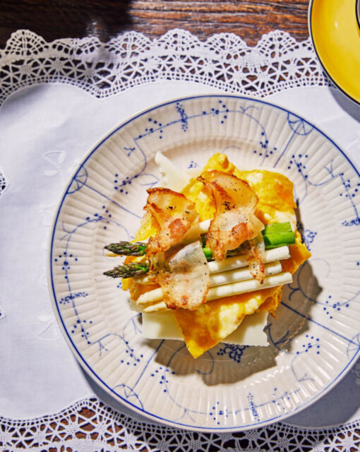 Cook a large omelet that is still runny; this is called ‘baveuse’. Cut the omelet into quarters and place the pieces on the rolls with cheese. Top with the roasted asparagus and crispy guanciale, and cover with the ‘hats’ of the rolls.