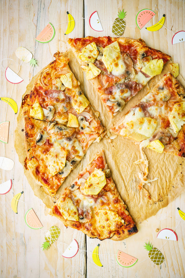 Slide the pizza with the baking paper out of the oven onto a plate and cut it into pieces.