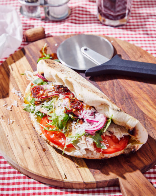 Filling the sandwich: Open the pizza sandwich again and fill it with the tomato slices, pieces of mackerel, arugula, pickled onion, and Parmesan cheese. Finish with chili oil.