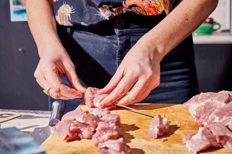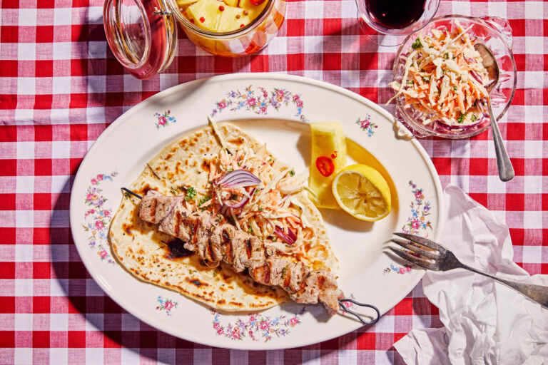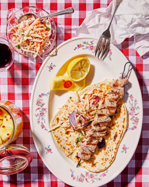 Pork skewers with naan, coleslaw, and pickled chili-pineapple