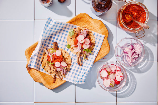 To serve grill the tacos on each side for 15 seconds, place a lot of pulled pork on it, and the sauce, onion, radish and parsley and serve immediately! Serve some hot sauce for fans of spicy 😉