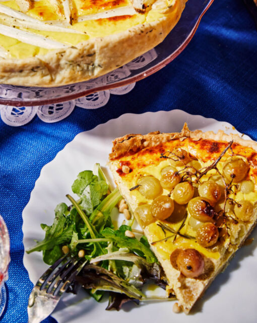 Remove the baking paper with the beans or beads, pour the cheese mixture onto the bottom. Add the grapes and rosemary.