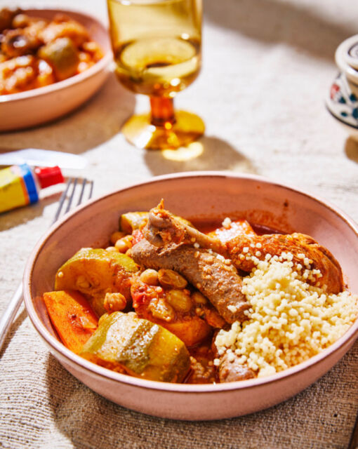 Serving: Fluff the couscous with a fork and serve it together with the chicken, merguez, vegetables, and the delicious broth. Optionally serve with some harissa for an extra spicy touch.