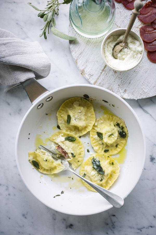 Add the ravioli to the marjoram and sage. Sauté briefly and add some cooking water.