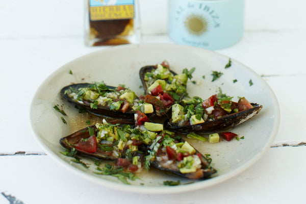 A surprising appetizer with raw mussels flavored with Hierbas de Ibiza, avocado, and tomatoes. Perfect for a summer evening!
