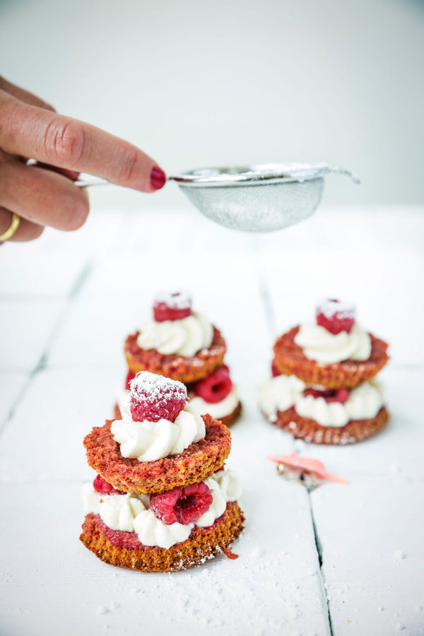 Cut each cupcake in half. Pipe whipped cream on the bottom half, place a few raspberries on top, and cover with the top half. Finish with whipped cream, a raspberry, and optionally powdered sugar.