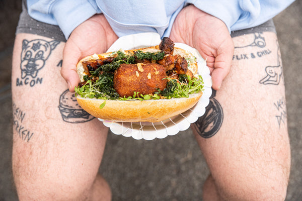 Sandwich with freshly baked bacon, cheese croquette, and tartar sauce