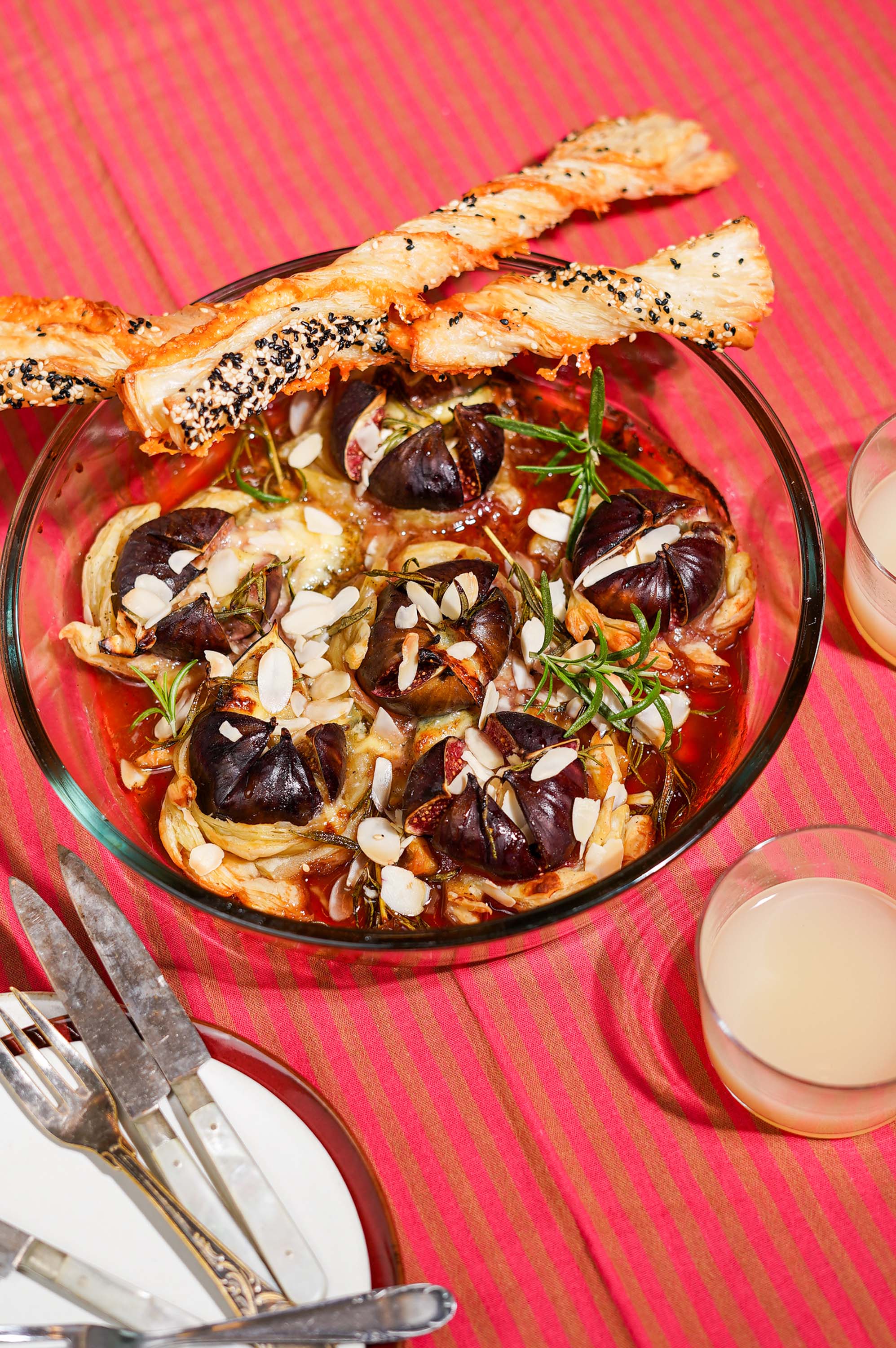 Roll the figs lengthwise in the puff pastry along their base. Place the figs in a large baking dish and top each with a cube of cheese.
