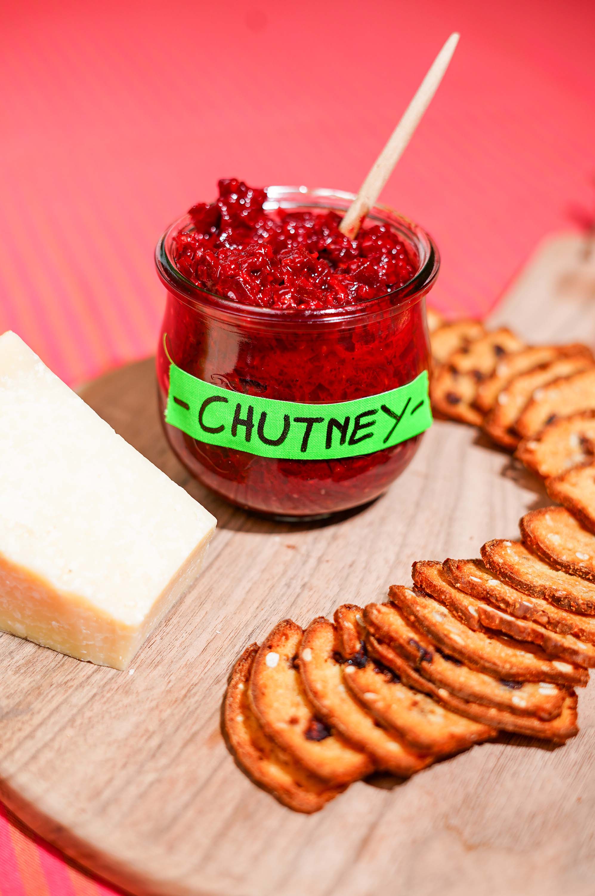 Arrange the cambozola croquettes on top and garnish with parsley and chives. Serve with a small bowl of beetroot chutney.
