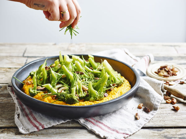 Soft pumpkin with broccoli and mustard nuts