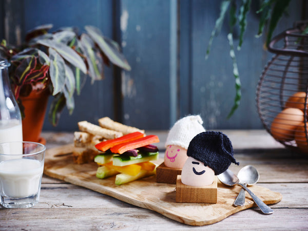 The eggs decorated with a hat and smiley. Vegetables and bread stacked. Ideal for a snack, shelling veggies! Discover the full recipe here!