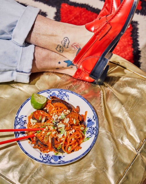 Mix in the fried eggplants. Heat everything again and sprinkle with peanuts and spring onion. Drizzle with lime.