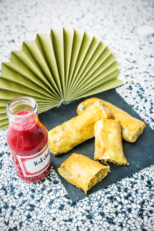 Fold the top piece down over the filling and press down firmly. Fold the left side and then the right side over the filling. Roll the spring roll downwards.