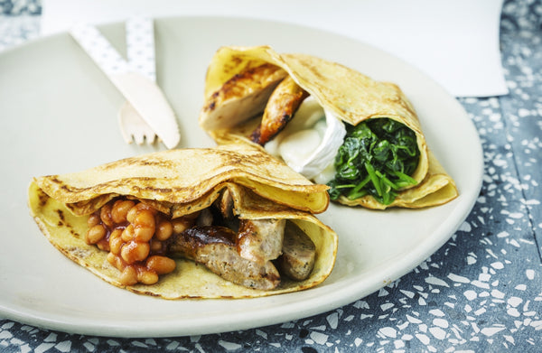 Set the fillings on the table and fill the pancake, for example, with chipolata and beans or with spinach, goat cheese, and chicken.