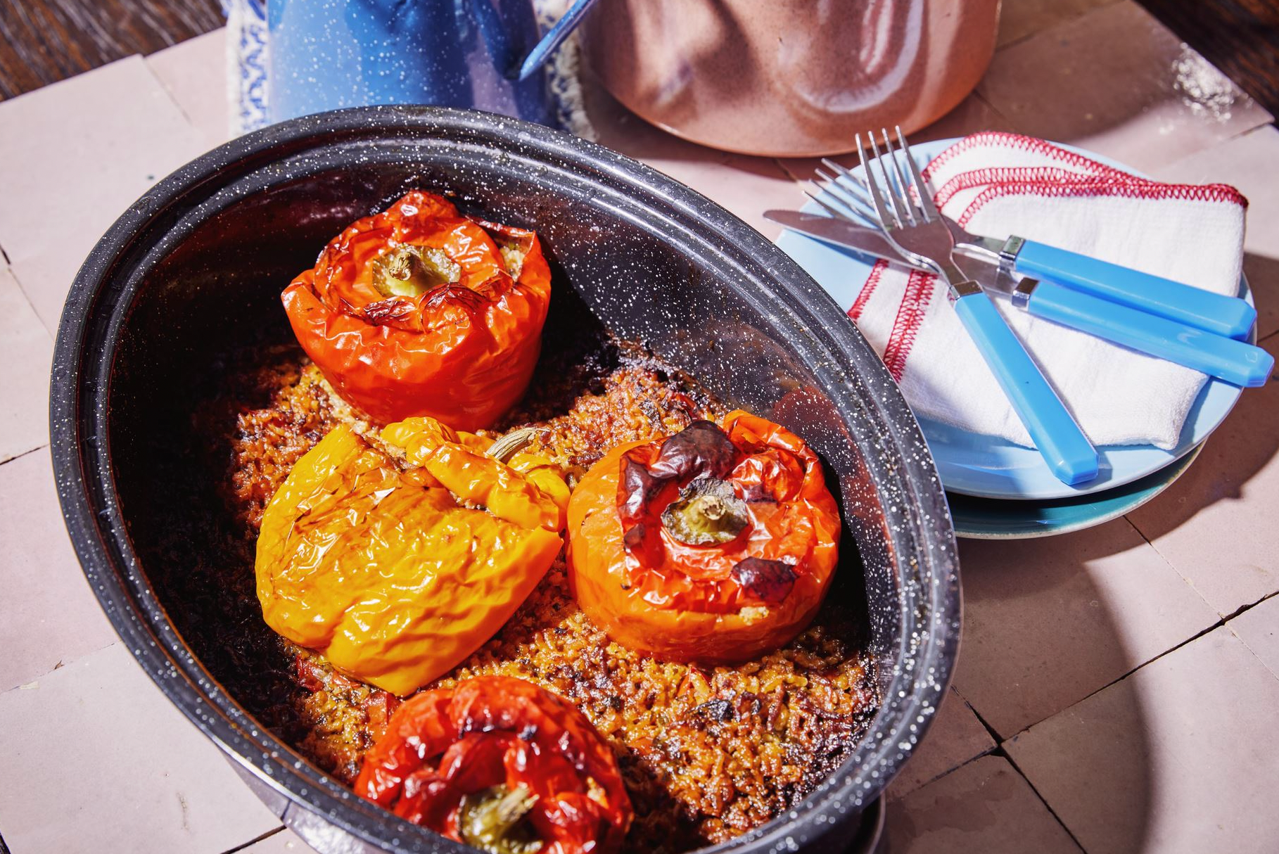 Put the lid on and let it cook gently for 2 hours, feel free to check if you need to raise your oven temperature a bit, the peppers will rise beautifully.