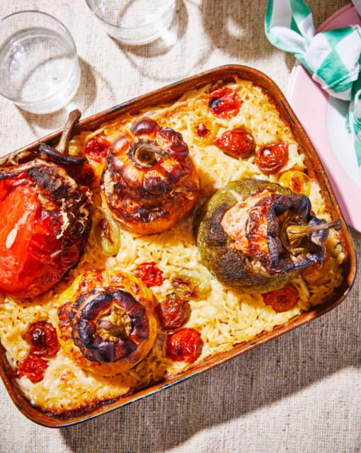 Assembling the casserole: Sprinkle the orzo around the stuffed peppers in the baking dish. Add the chicken broth and cherry tomatoes and stir briefly.