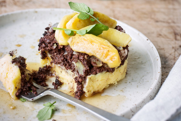 Spoon the mashed potatoes onto a plate. Distribute the blood sausage over it.