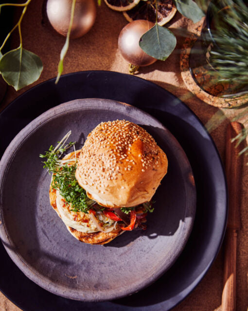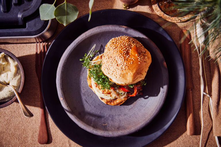 Turkey burgers with guanciale, pepper mayonnaise, and grilled Provençal vegetables