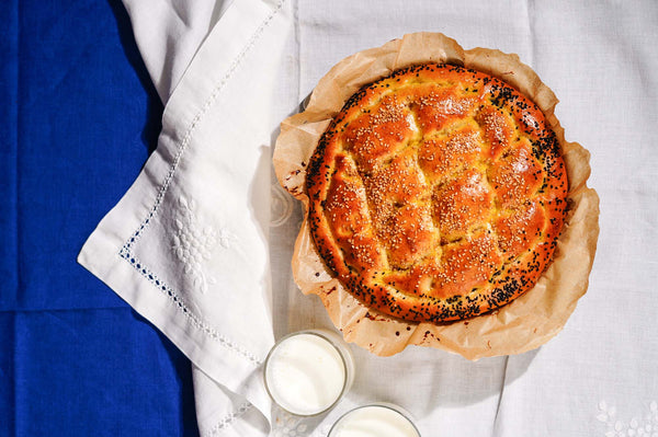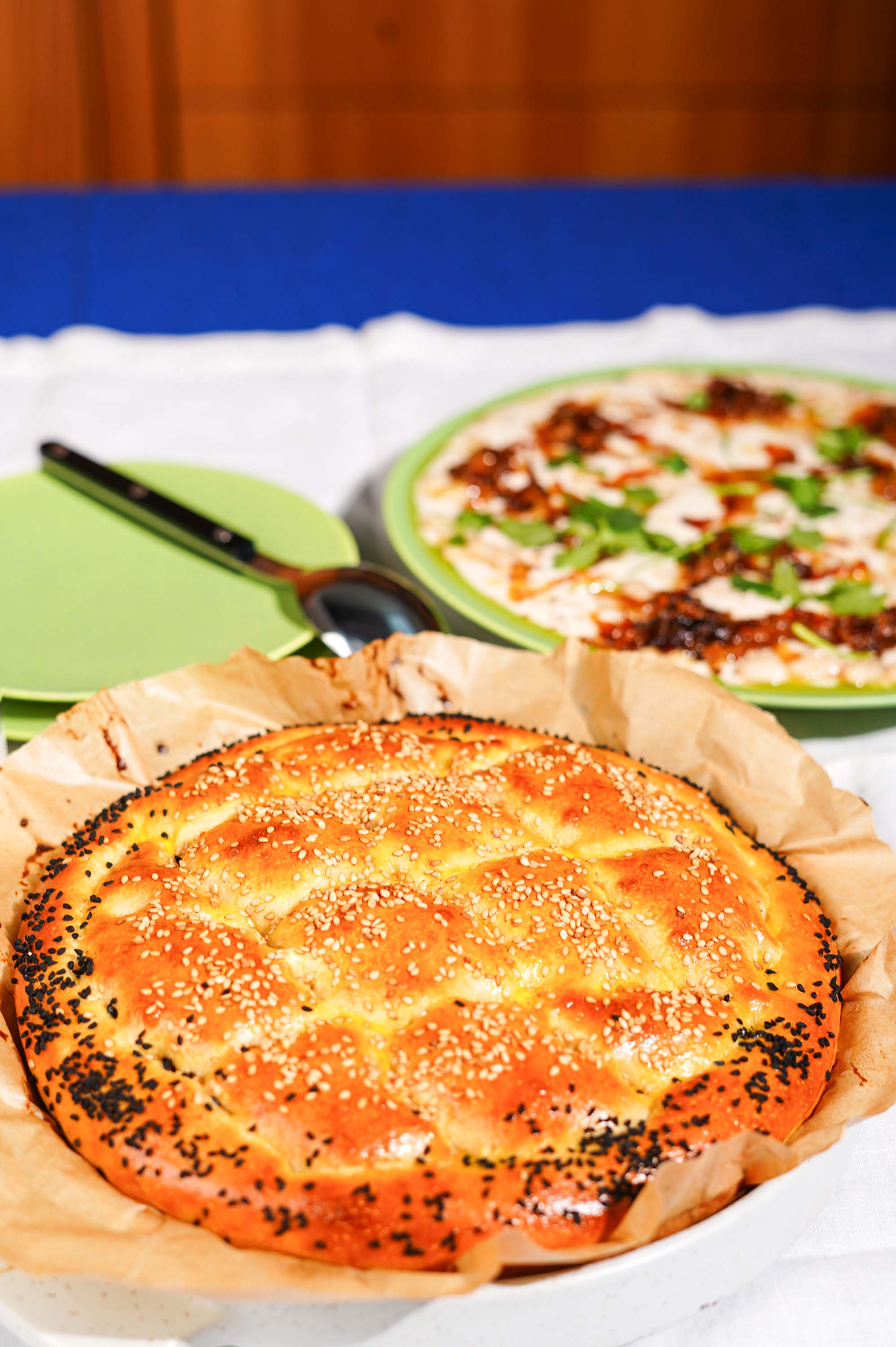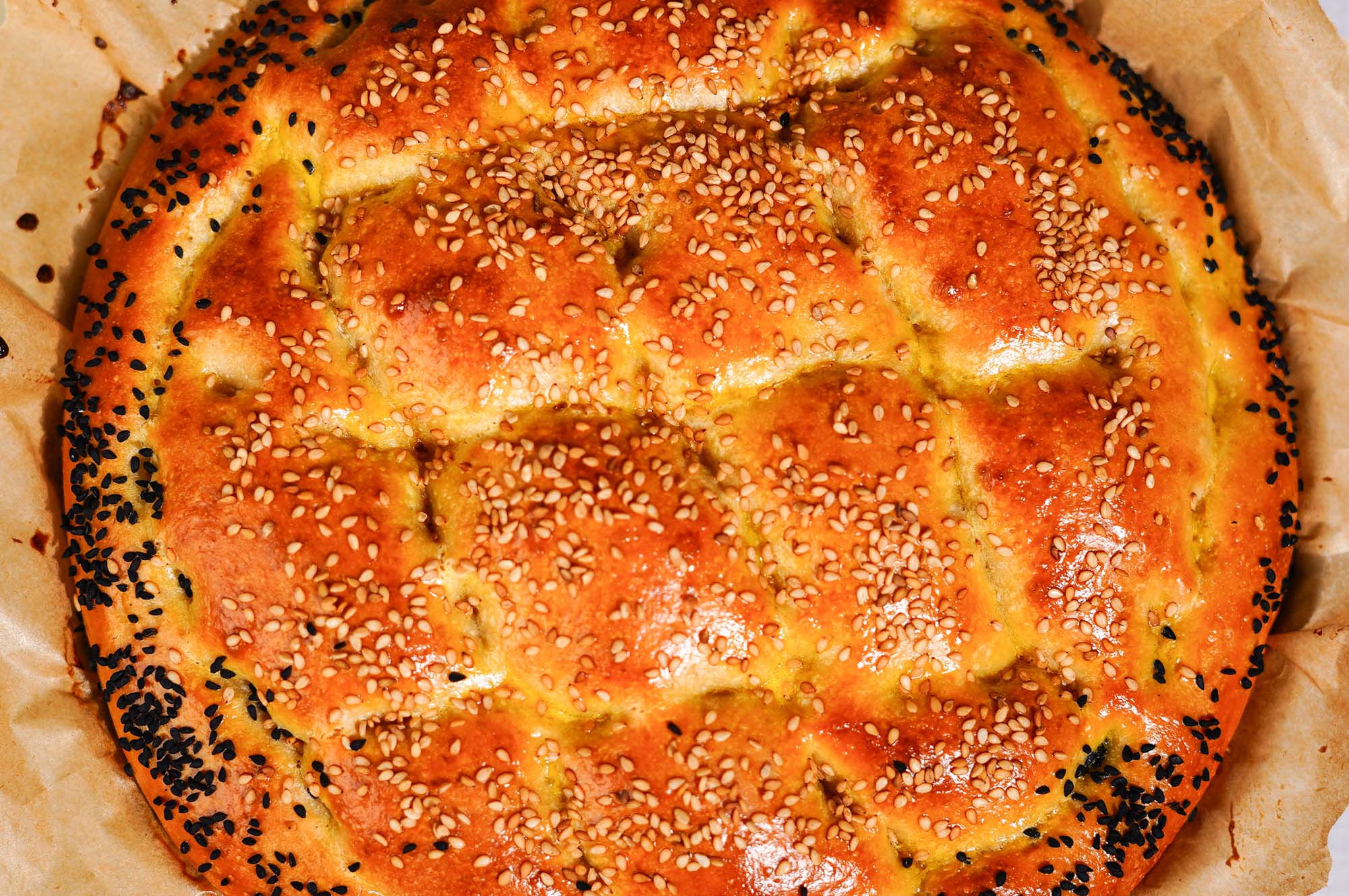 Brush and decorate: Generously brush the bread with the egg wash. Use your fingers to create the typical pattern: first press a circle around the edges, then push lines with your fingers to create square shapes in the middle. Finish with sesame seeds on the outer edge and nigella seeds in the center.