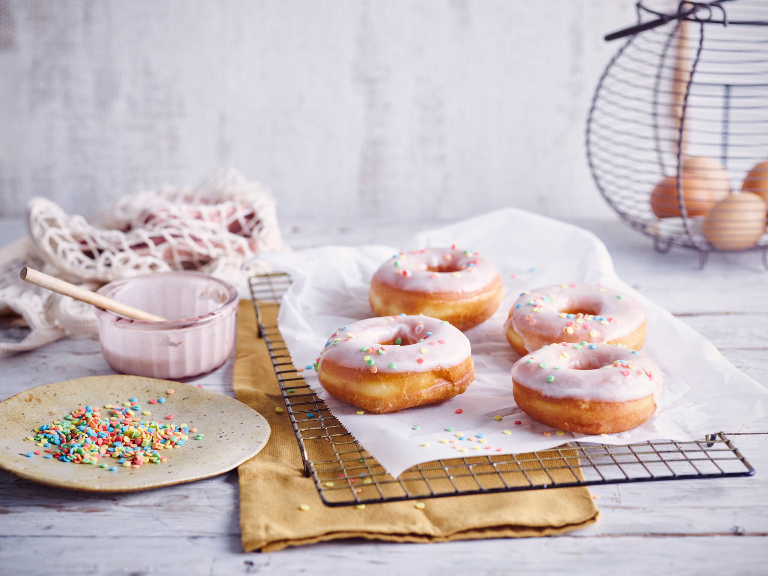 Dip the donut one by one along one half in the icing and immediately sprinkle the sprinkles on top, otherwise, they wonโt stick anymore, continue like this.