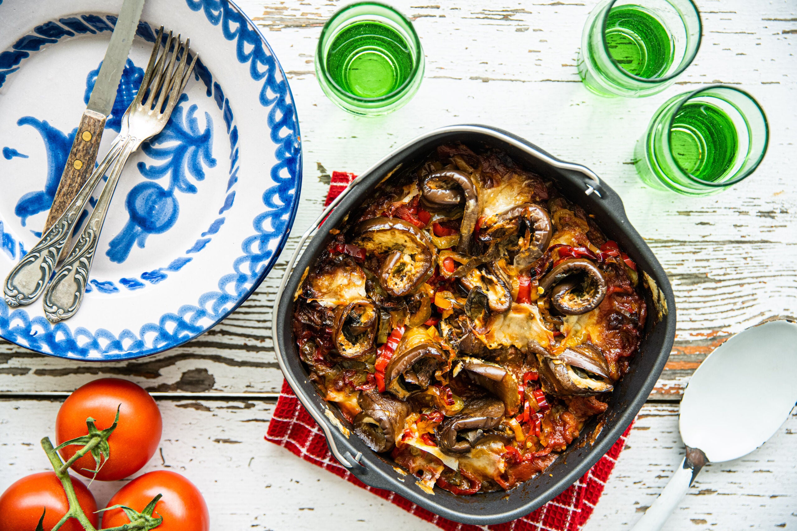 Place the eggplant upright in the baked peppers and pour the sauce in between. Add some parmesan shavings and bake for 30 minutes at 150ยฐC.