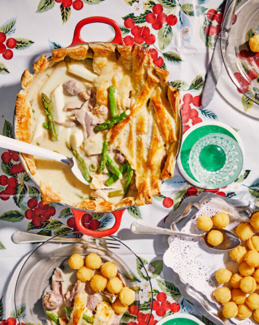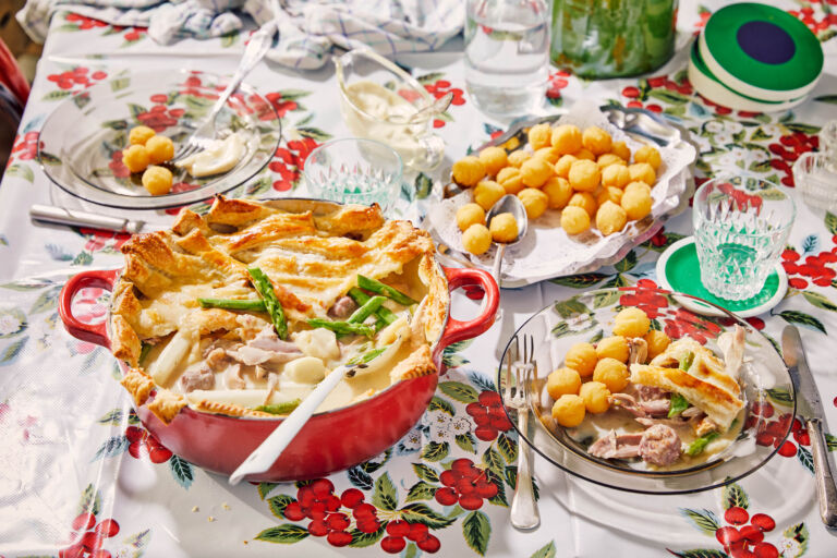 Cut the dough into squares or circles or into thick strips and lay it in a staggered manner over the vol-au-vent in the dish. Brush with the milk-egg mixture and let it color for 30 minutes in the oven.